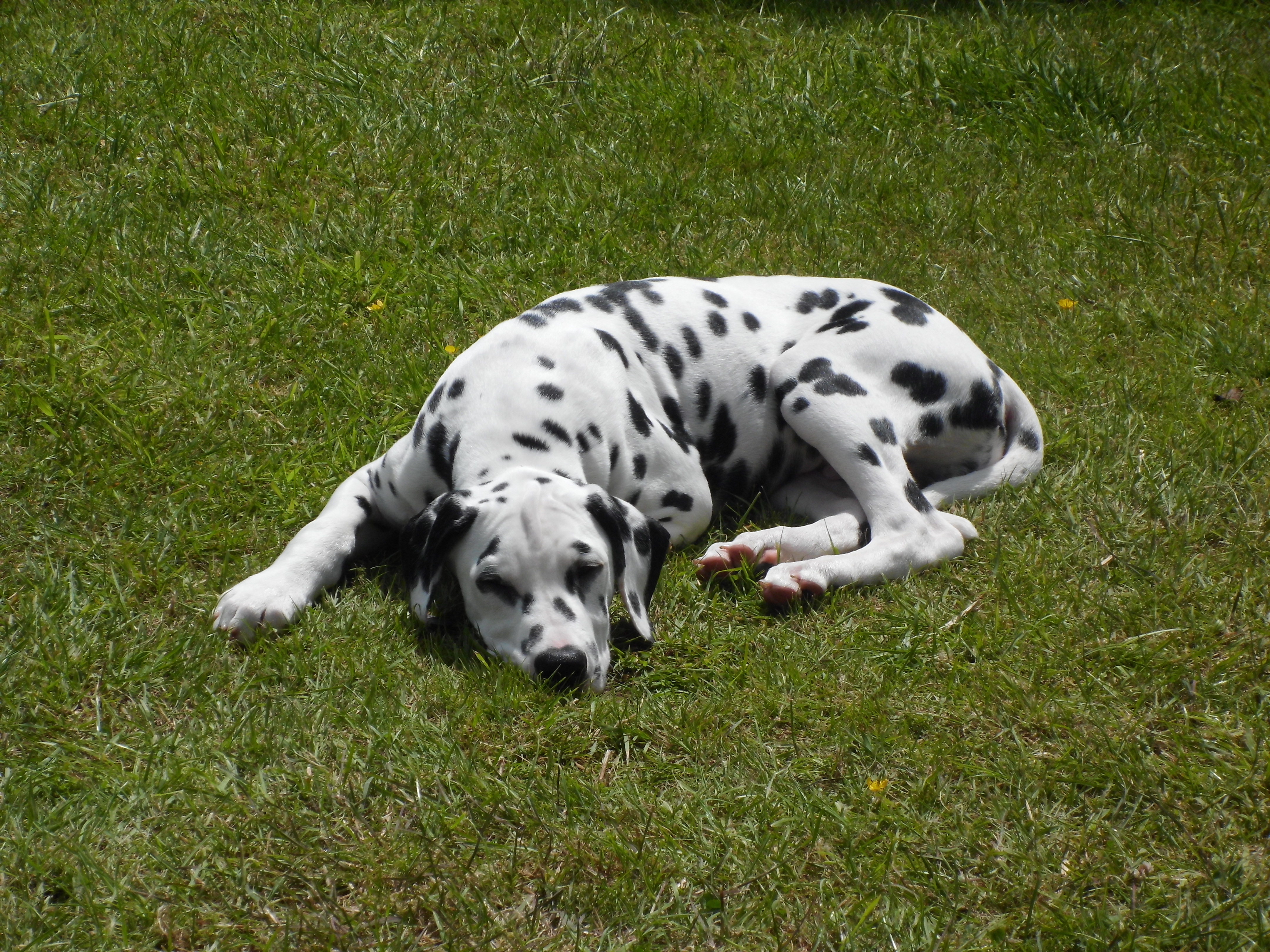 Er ist sehr sozial, ein freudiger, freundlicher Dalmatiner, kuschelt gerne, liebt Kinder, Welpen und andere Hunde über alles.